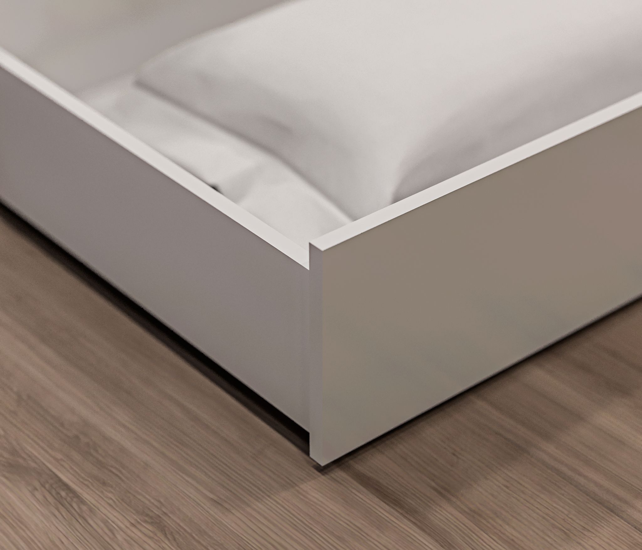 Ящик легко выдвигается и скрывается под кроватью, не занимая лишнего места. Он представляет собой удобное решение для хранения, позволяющее максимально использовать пространство в спальне.